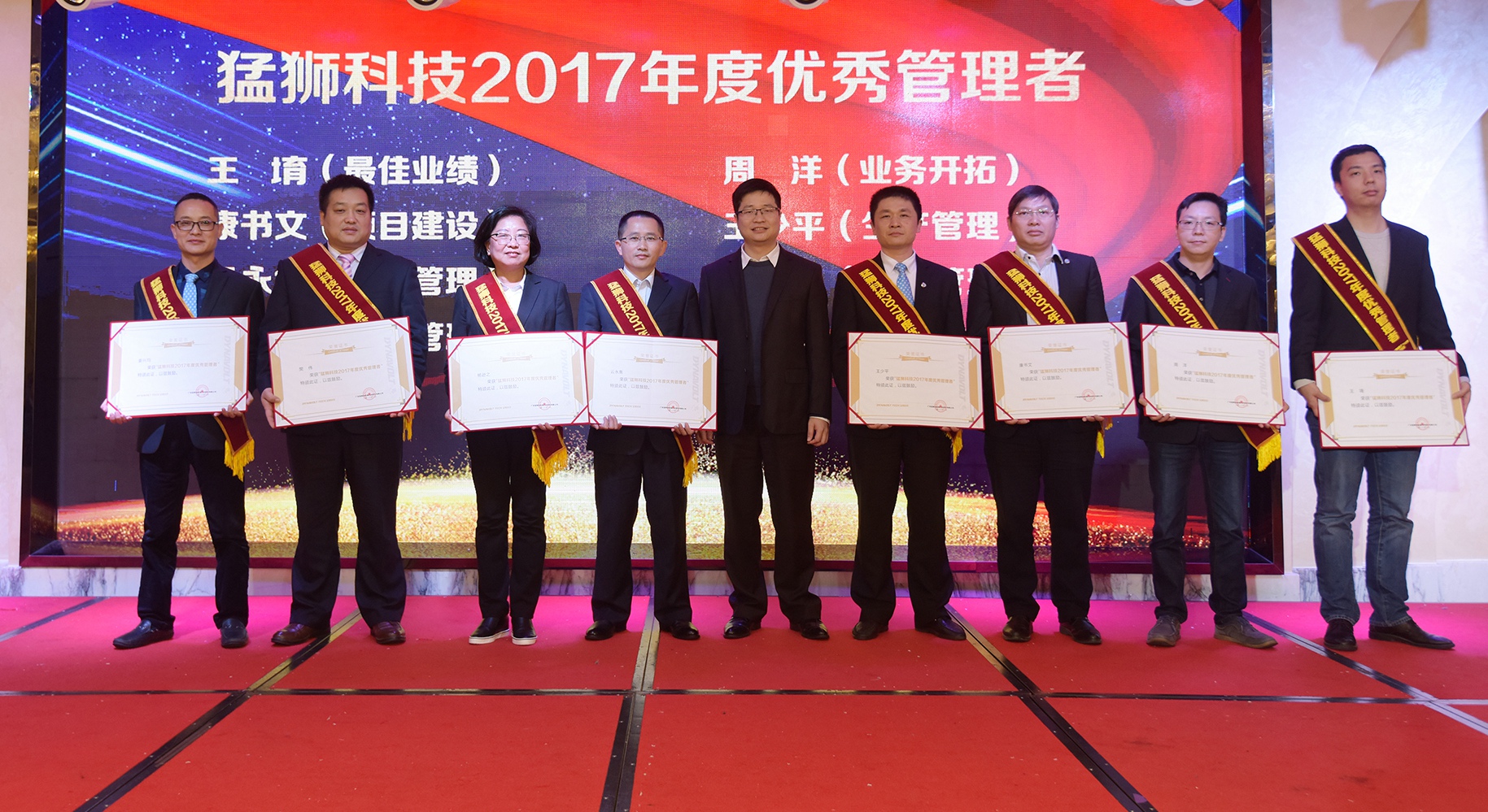 大会对荣获“猛狮科技2017年度优秀员工”、“猛狮科技2017年度优秀管理者”、“猛狮科技2017年度企业文化建设先进单位”、“猛狮科技2017年度经营管理先进单位”、“卓越团队董事长特别奖”、“卓越员工董事长特别奖”的先进个人和优秀团队进行了表彰,并揭晓了“猛狮科技2017年度十大品牌文化事件”和“猛狮科技2017年度十大科研事件”。