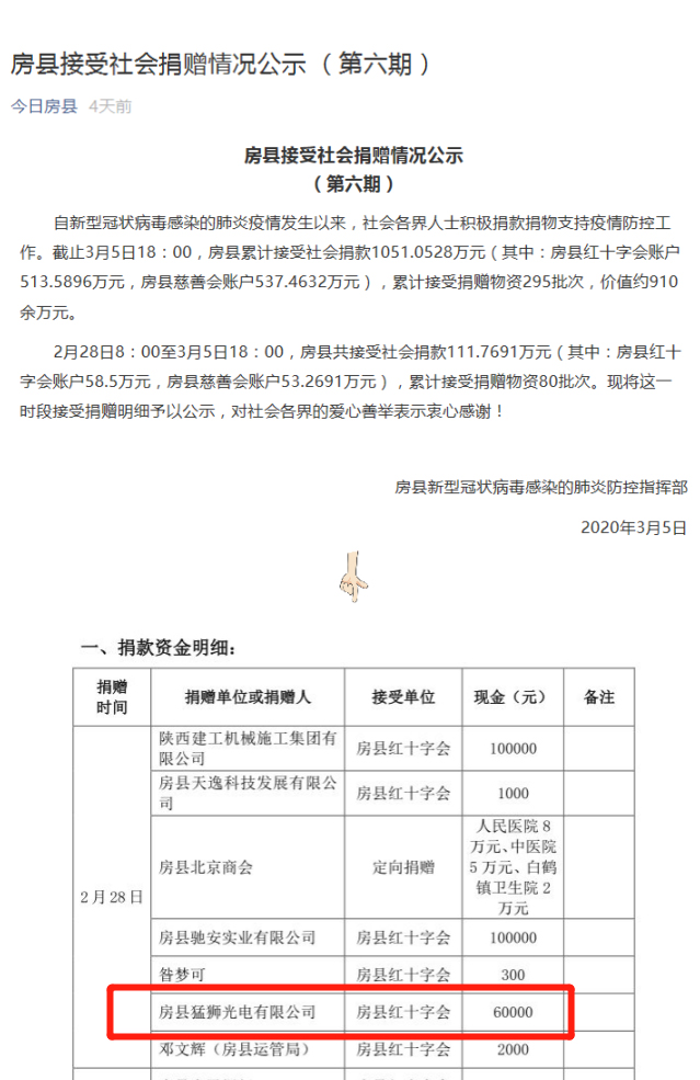 近日,猛狮科技旗下房县猛狮光电有限公司收到中共房县县委、房县人民政府联合发来的《感谢信》,感谢房县猛狮光电积极响应县委县政府“心怀大爱、情系房县”捐赠活动,共筹措善款6万元,捐献给房县红十字会,用于房县抗击疫情工作。