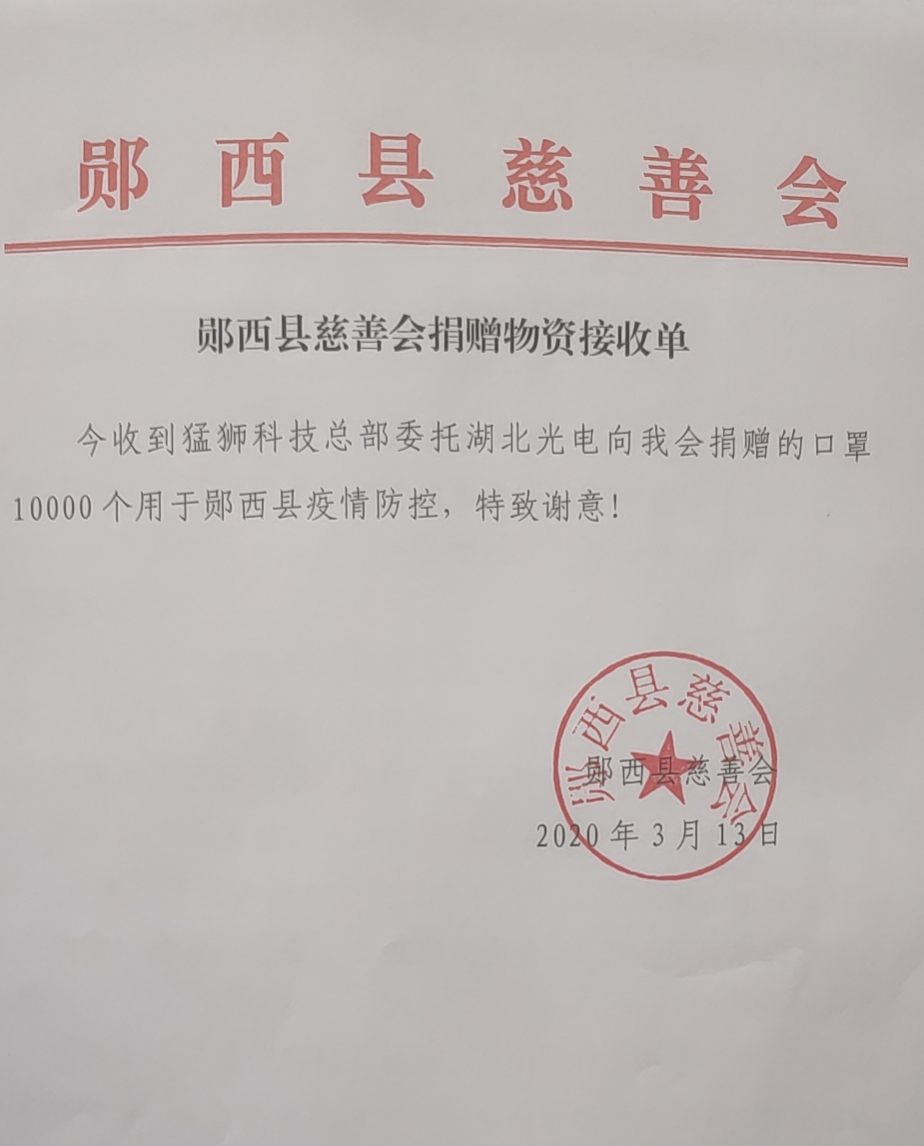 今年以来,在湖北省成为新冠病毒肺炎重点区域的情况下,十堰市郧西县的防疫工作面临严峻考验。近日,猛狮科技旗下子公司湖北猛狮光电有限公司收到郧西县慈善会发来的《捐赠物资接收单》,感谢猛狮科技委托湖北猛狮光电捐赠口罩10000只,用于郧西县疫情防控工作。