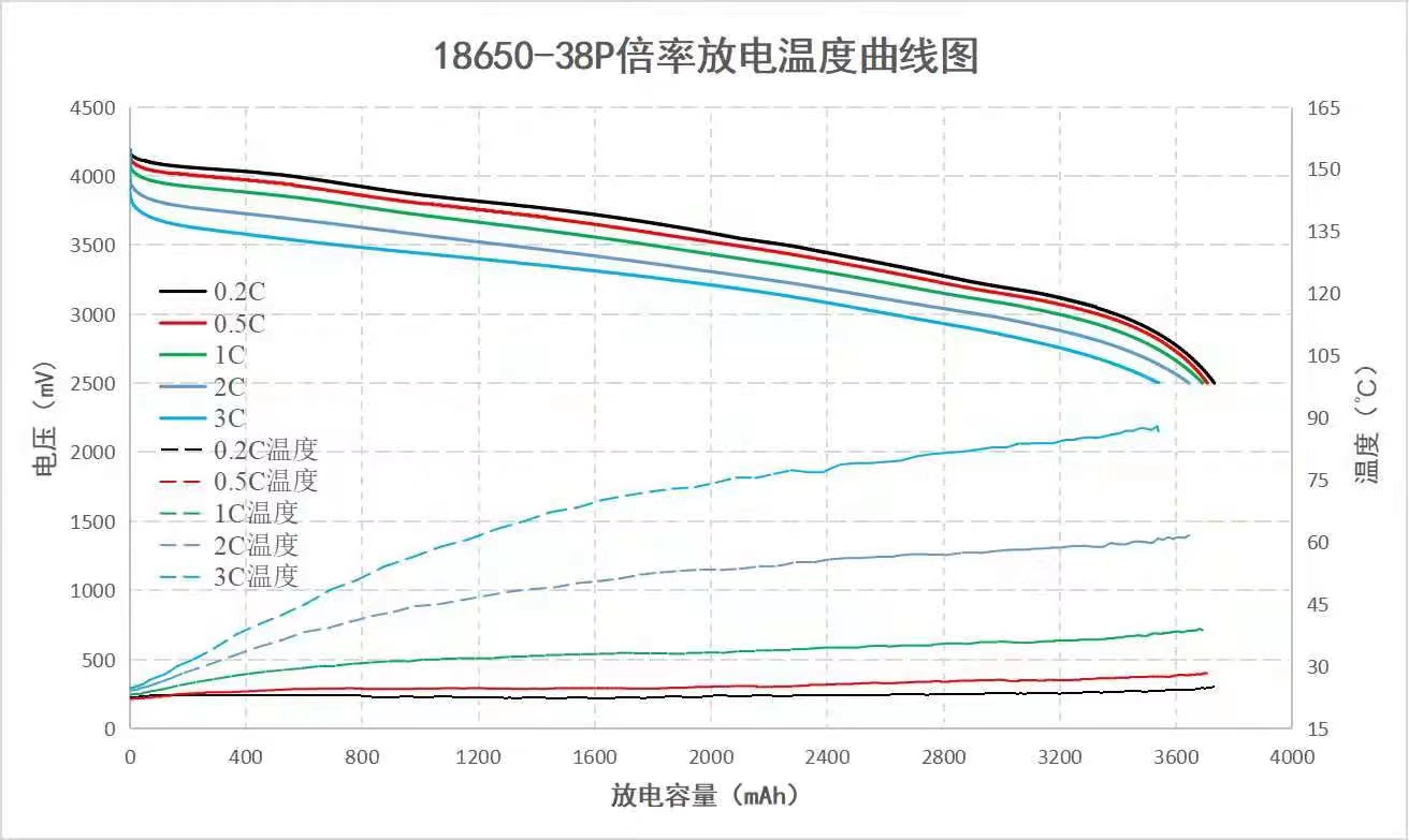 猛狮科技18650-38P动力电芯在不同放电倍率下的温度曲线