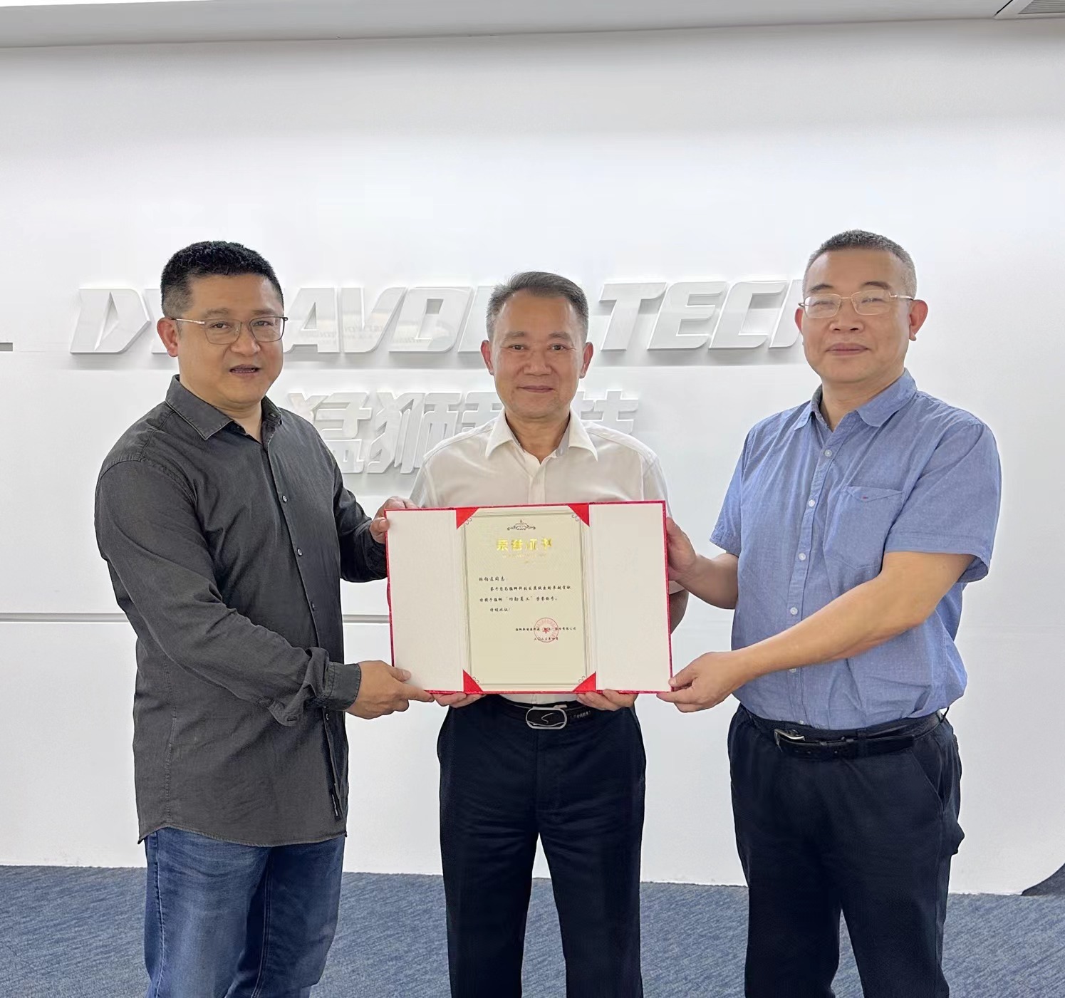 猛狮科技陈乐伍董事长(左)、王少武总裁(右)授予林伯连同志“功勋员工”荣誉证书